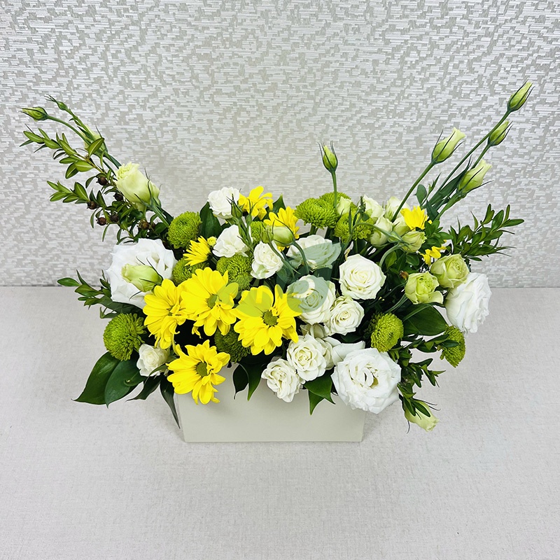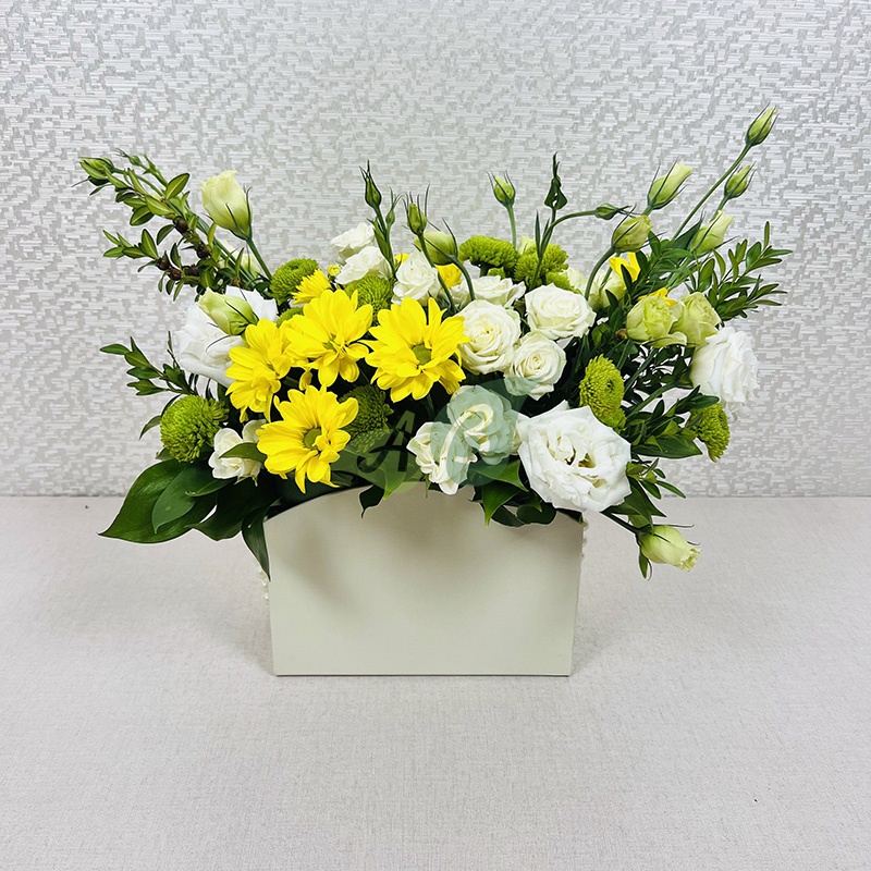 Облако кустовых роз и желтые хризантемы в коробке – такую прелесть можно заказать с доставкой в любой район Верещагино.