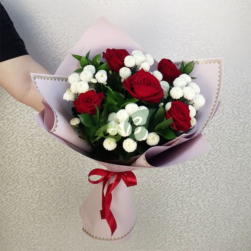 5 красных роз в сочетании с белой хризантемой и зеленью рускуса выглядит просто великолепно. Он говорит о вкусе дарителя, о том, что он ценит неповторимость того, кому предназначен этот букет.